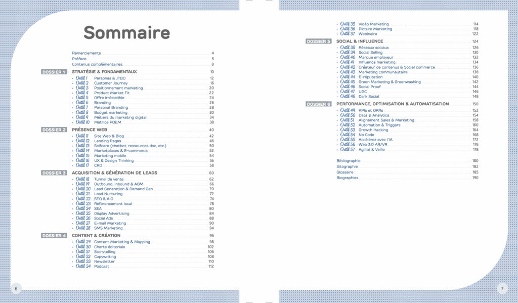 « La boîte à outils » des éditions Dunod est une collection d’ouvrages thématiques sur les métiers et les enjeux du monde professionnel d’aujourd’hui. La boîte à outils du marketing digital se compose de 57 fiches pratiques réparties dans 6 dossiers avec un pack de prompts IA accessible en ligne à destination des directeurs(trices) et responsables marketing et webmarketing mais aussi pour les entrepreneurs(ses), dirigeant(e)s et consultant(e)s.